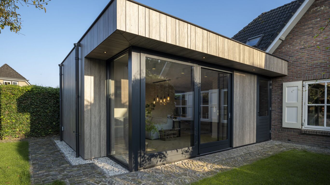 "Het is uiteindelijk nog mooier geworden dan we vooraf hadden durven hopen. De grijze Rhinestone Oak gevelpanelen contrasteren met de boerenstijl van onze wening, maar juist dat contrast zorgt ervoor dat het geheel gewoon klopt. We zijn dan ook enorm blij met het resultaat, het past perfect bij de stijl van de woning".